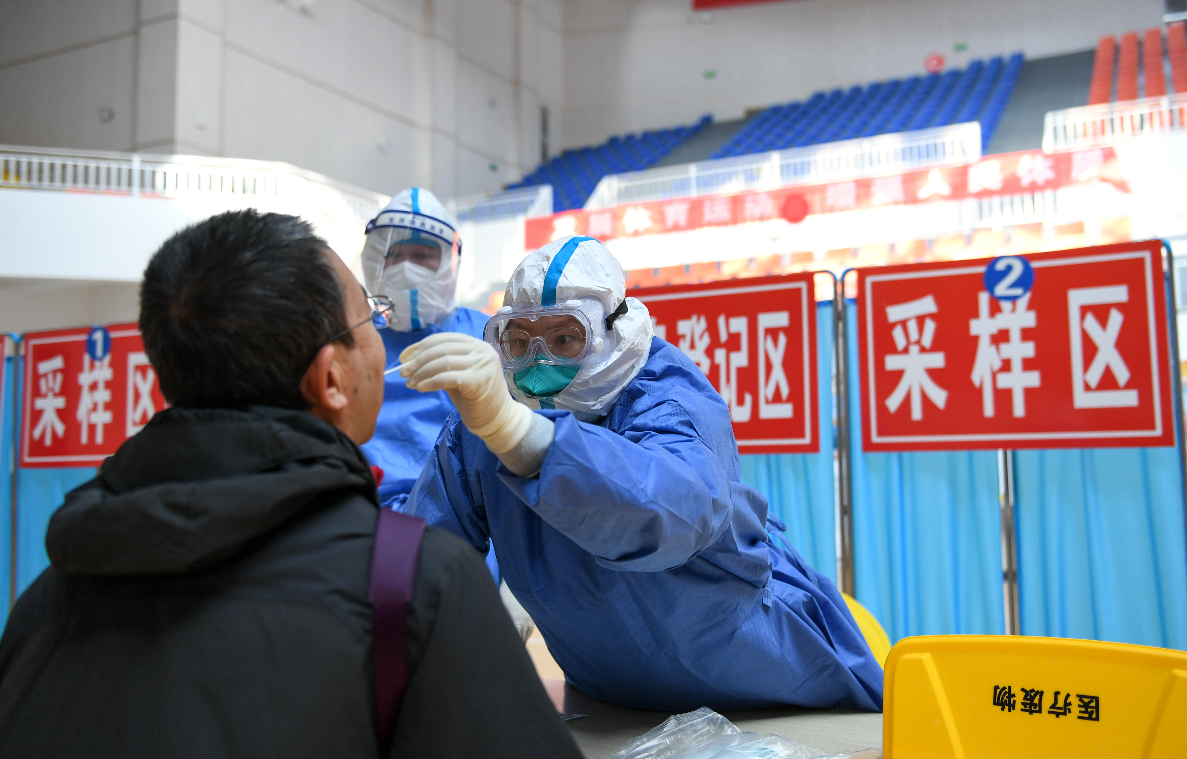 10月22日,在額濟(jì)納旗文體中心核酸采樣點(diǎn)內(nèi),醫(yī)務(wù)人員進(jìn)行核酸采樣。 新華社記者 貝赫 攝