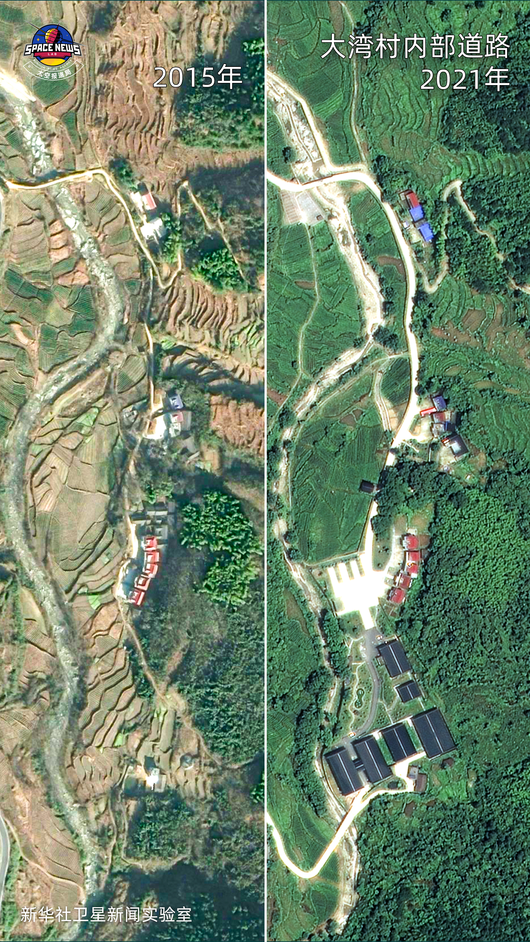 衛(wèi)星見證了易地扶貧搬遷新居“從無到有”。大灣村共建設(shè)4個(gè)易地扶貧搬遷新居點(diǎn),搬遷群眾129戶439人。