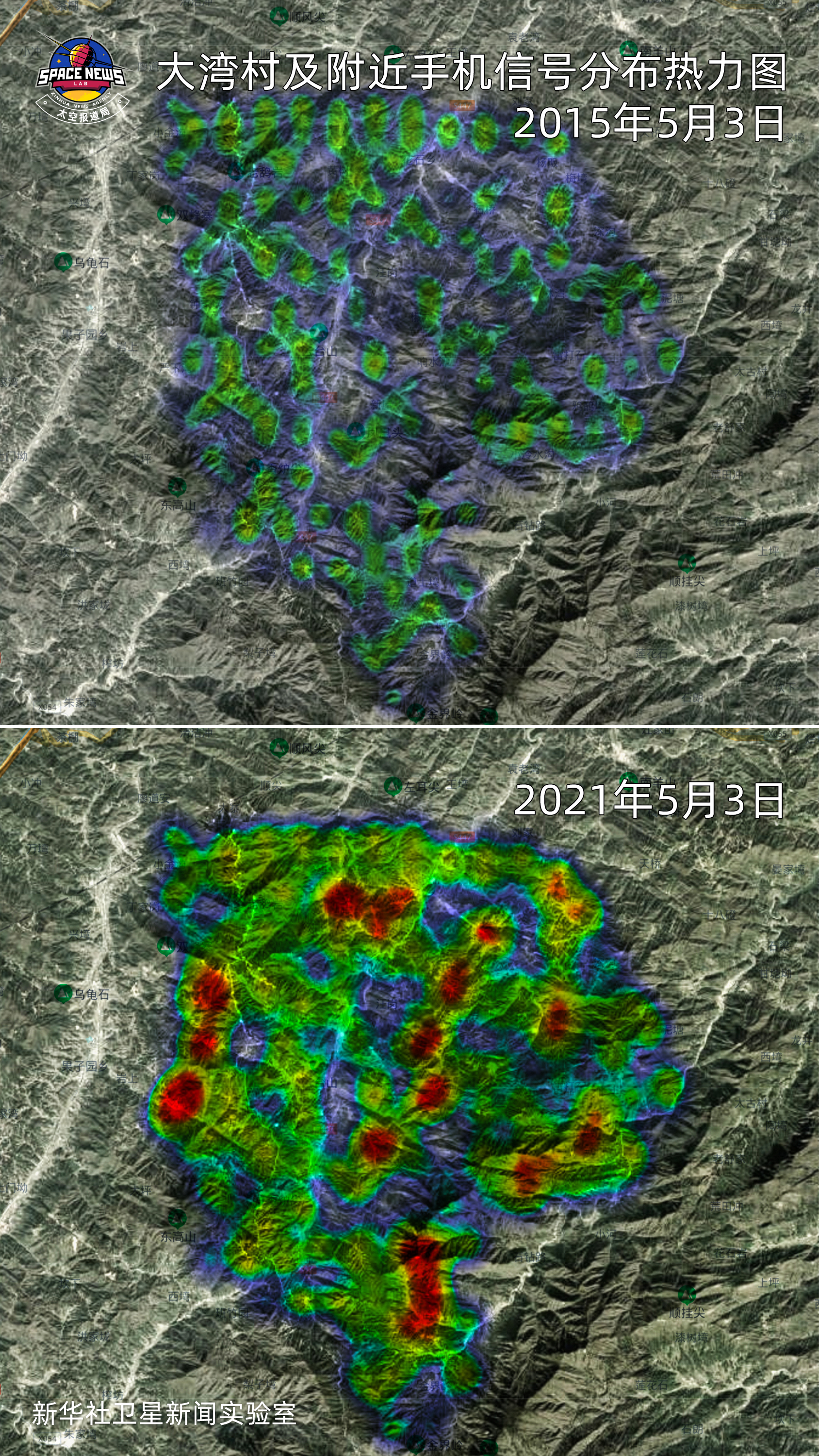 有色區(qū)域代表手機(jī)信號,信號密度越大,顏色越深。與2015年相比,更大范圍、更密集的手機(jī)信號,反映出大別山區(qū)大幅增長的人流量。