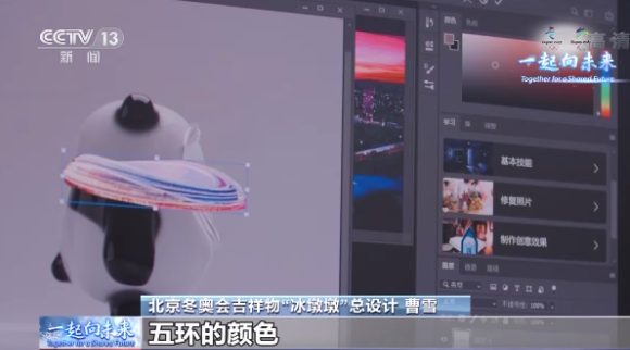 北京冬奧會吉祥物冰墩墩總設(shè)計 曹雪:速滑館它是一個曲面的造型,它跟我們熊貓臉部的這個開口是吻合的,五條絲帶,五環(huán)的顏色,我們把它用在了熊貓的臉上。