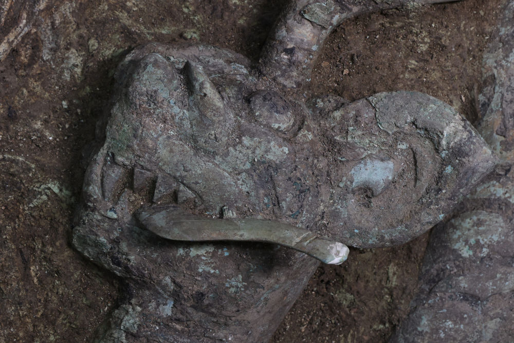 三星堆8號(hào)“祭祀坑”新發(fā)現(xiàn)的虎頭龍身青銅像。(趙昊攝)