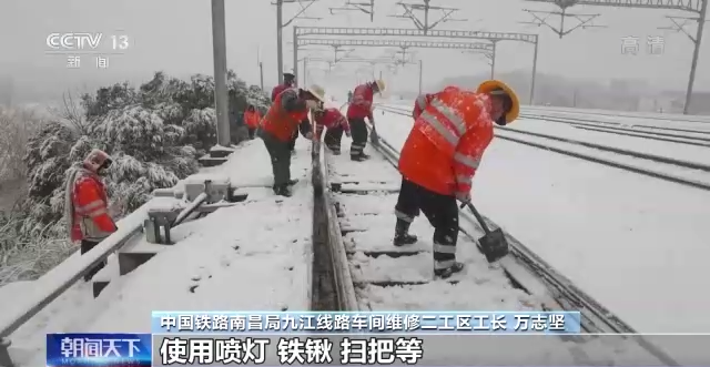 中國鐵路南昌局九江線路車間維修二工區(qū)工長 萬志堅:啟動道岔融雪裝置,使用噴燈、鐵鍬、掃把等,對道岔、客車徑路等重點設(shè)備積雪、冰水進行清除,確保大雪天氣鐵路重點設(shè)備安全穩(wěn)定。