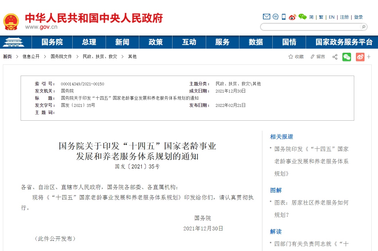 2月21日,中國政府網(wǎng)發(fā)布《國務(wù)院關(guān)于印發(fā)“十四五”國家老齡事業(yè)發(fā)展和養(yǎng)老服務(wù)體系規(guī)劃的通知》。《“十四五”國家老齡事業(yè)發(fā)展和養(yǎng)老服務(wù)體系規(guī)劃》中明確:①建立常態(tài)化指導(dǎo)監(jiān)督機(jī)制,督促贍養(yǎng)人履行贍養(yǎng)義務(wù),將有能力贍養(yǎng)而拒不贍養(yǎng)老年人的違法行為納入個人社會信用記錄;②探索設(shè)立獨生子女父母護(hù)理假;③推動公共場所適老化改造;④推進(jìn)智能化服務(wù)適應(yīng)老年人需求;等等。