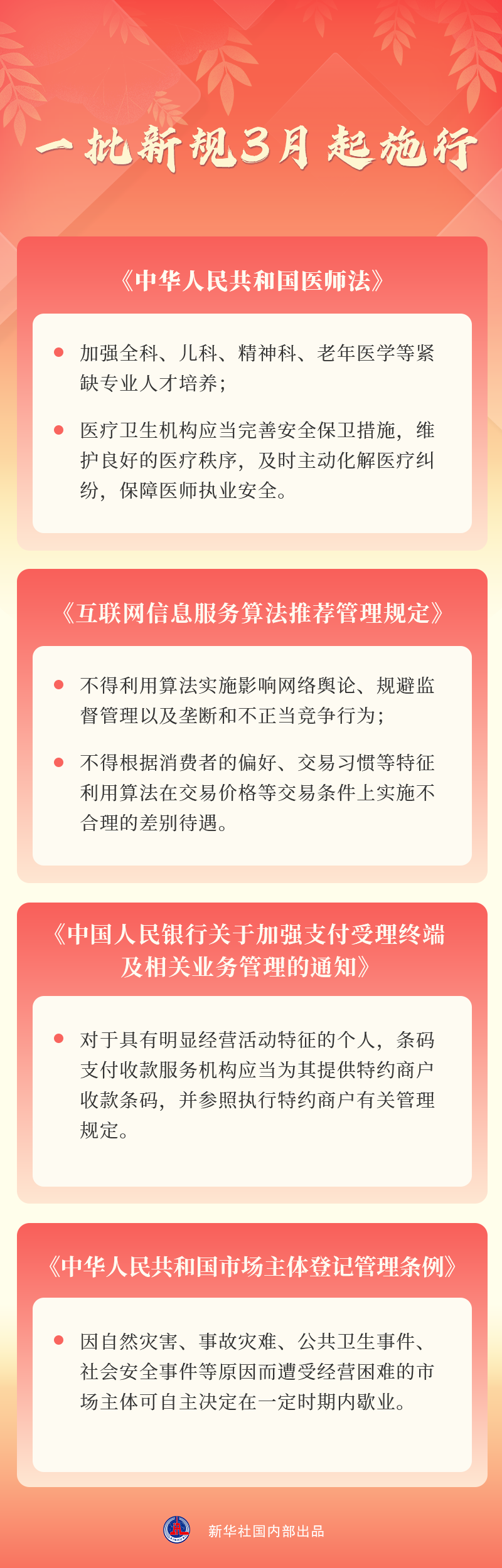 3月起 一批新規(guī)將正式落地實(shí)施 一起看看,哪些與你息息相關(guān) ↓↓↓ 全國新規(guī) 四部門:不得利用算法對(duì)消費(fèi)者實(shí)施不合理價(jià)格差別待遇 國家網(wǎng)信辦等四部門聯(lián)合發(fā)布《互聯(lián)網(wǎng)信息服務(wù)算法推薦管理規(guī)定》,自2022年3月1日起施行。 《規(guī)定》明確,算法推薦服...