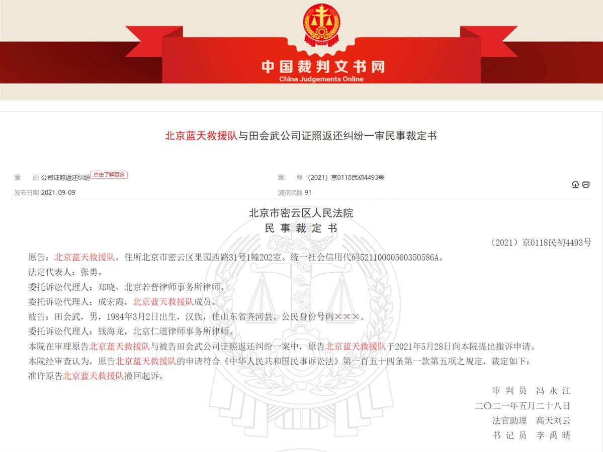 此外,中國裁判文書網(wǎng)顯示,2021年北京藍(lán)天救援隊(duì)分別就公司證照返還糾紛一事起訴了馮波濤、田會(huì)武,當(dāng)時(shí)的法定代表人系張勇。同年5月28日,原告北京藍(lán)天救援隊(duì)向法院提出了撤訴申請(qǐng)。馮波濤、田會(huì)武正是上述會(huì)議紀(jì)要中保管公章的人員。