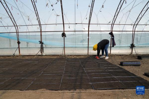 4月19日,在哈爾濱市道外區(qū)民主鎮(zhèn)光明村一棟育秧大棚內(nèi),村民在進(jìn)行育秧準(zhǔn)備工作。