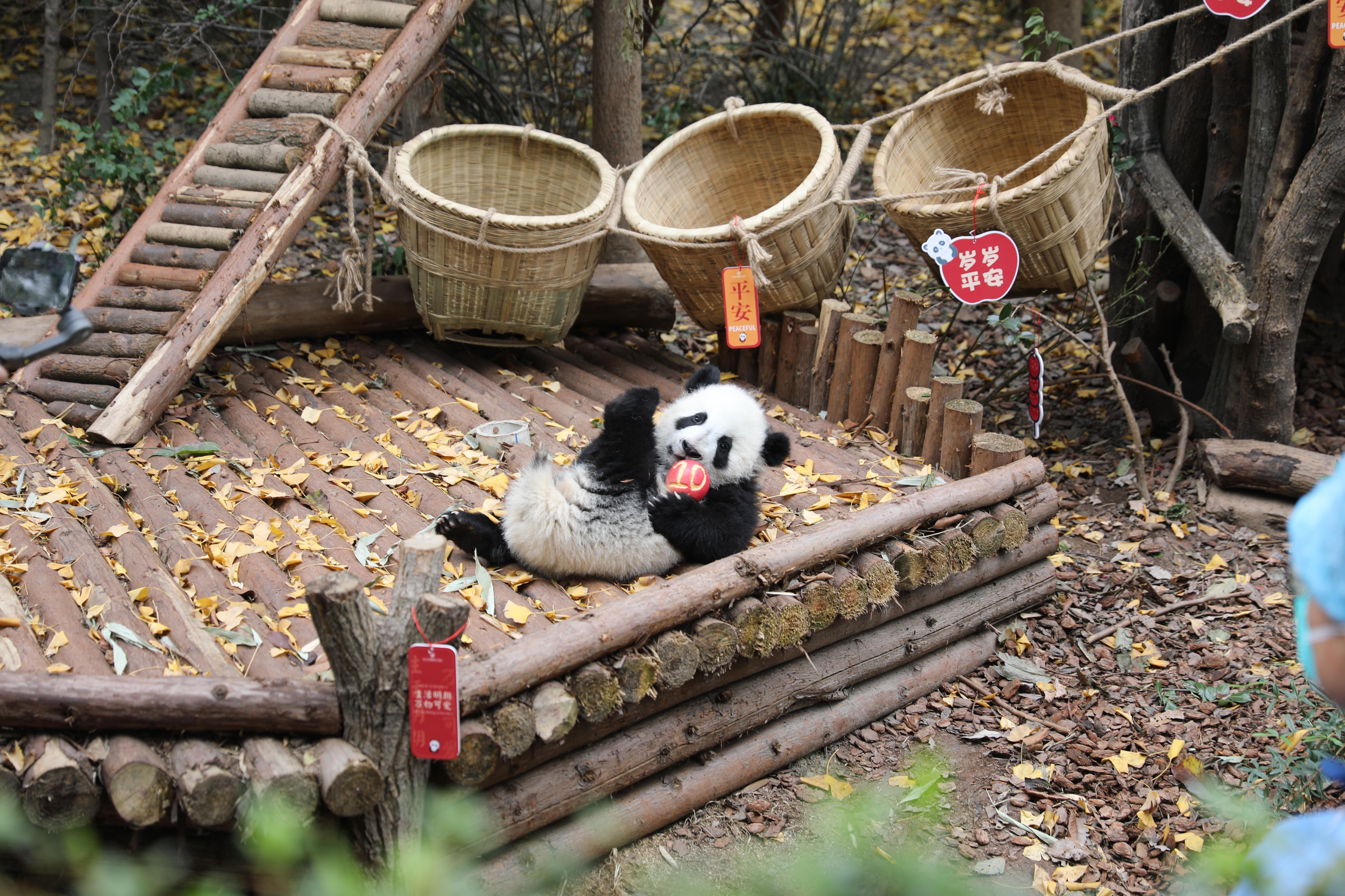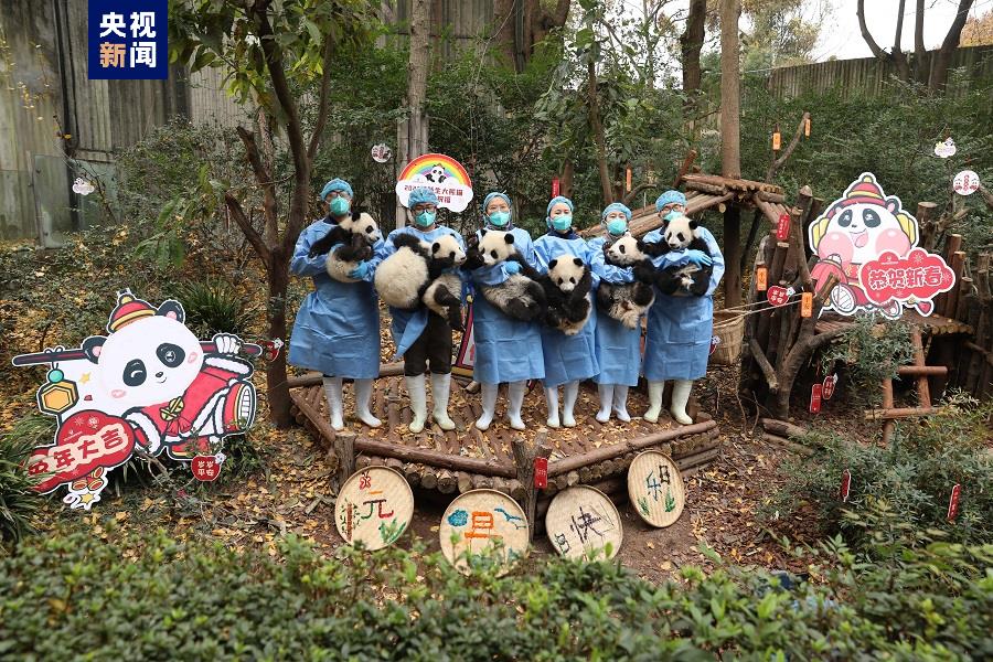 2022年12月29日,元旦到來前夕,成都大熊貓繁育研究基地一派喜氣,13只半歲左右的大熊貓寶寶元氣滿滿集體亮相,向全國人民送上最萌的新年祝福。(總臺記者 趙雄)