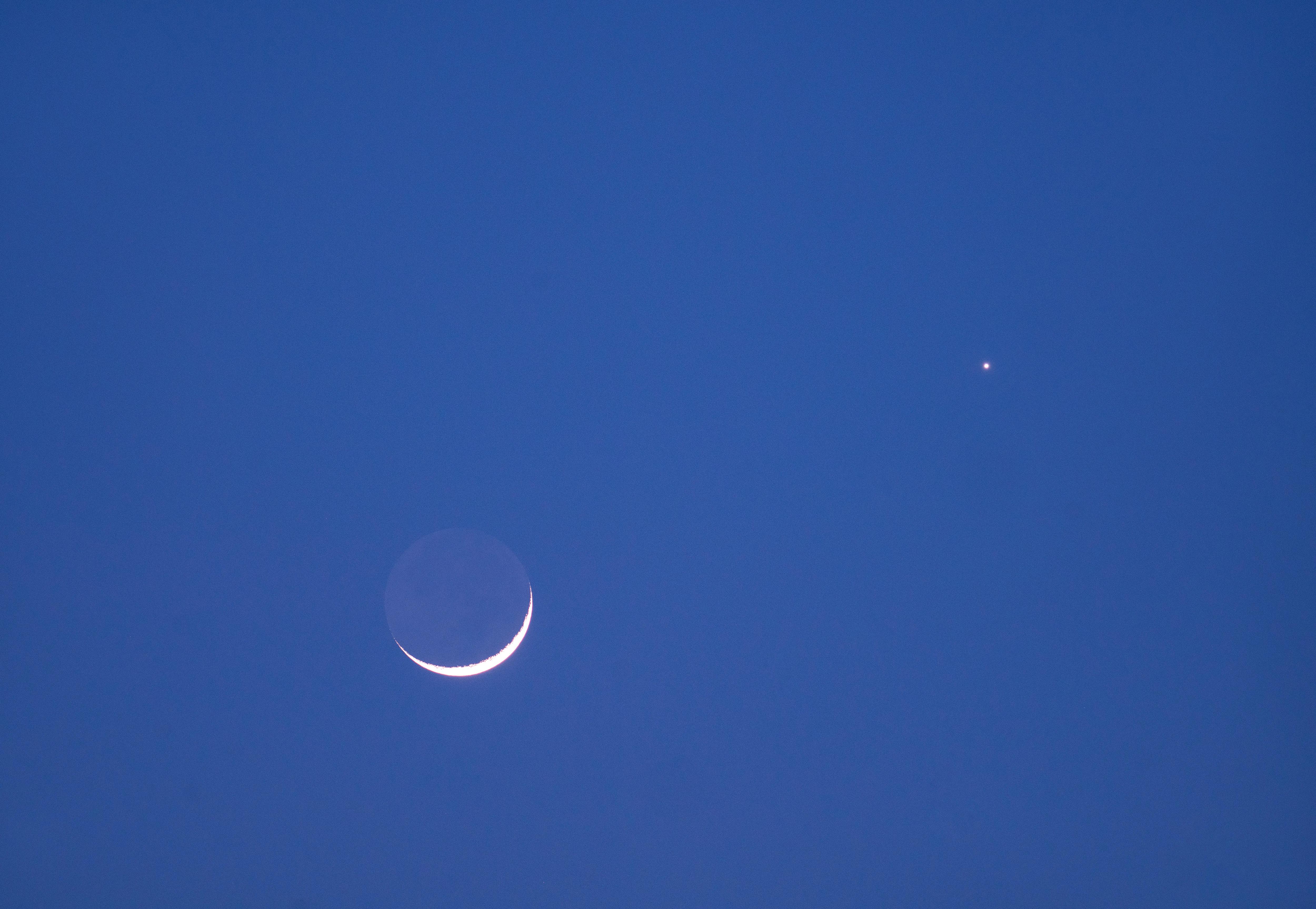 云南省星空攝影愛(ài)好者羅新才2023年4月23日在大理洱源拍攝的金星伴月。(本人供圖)