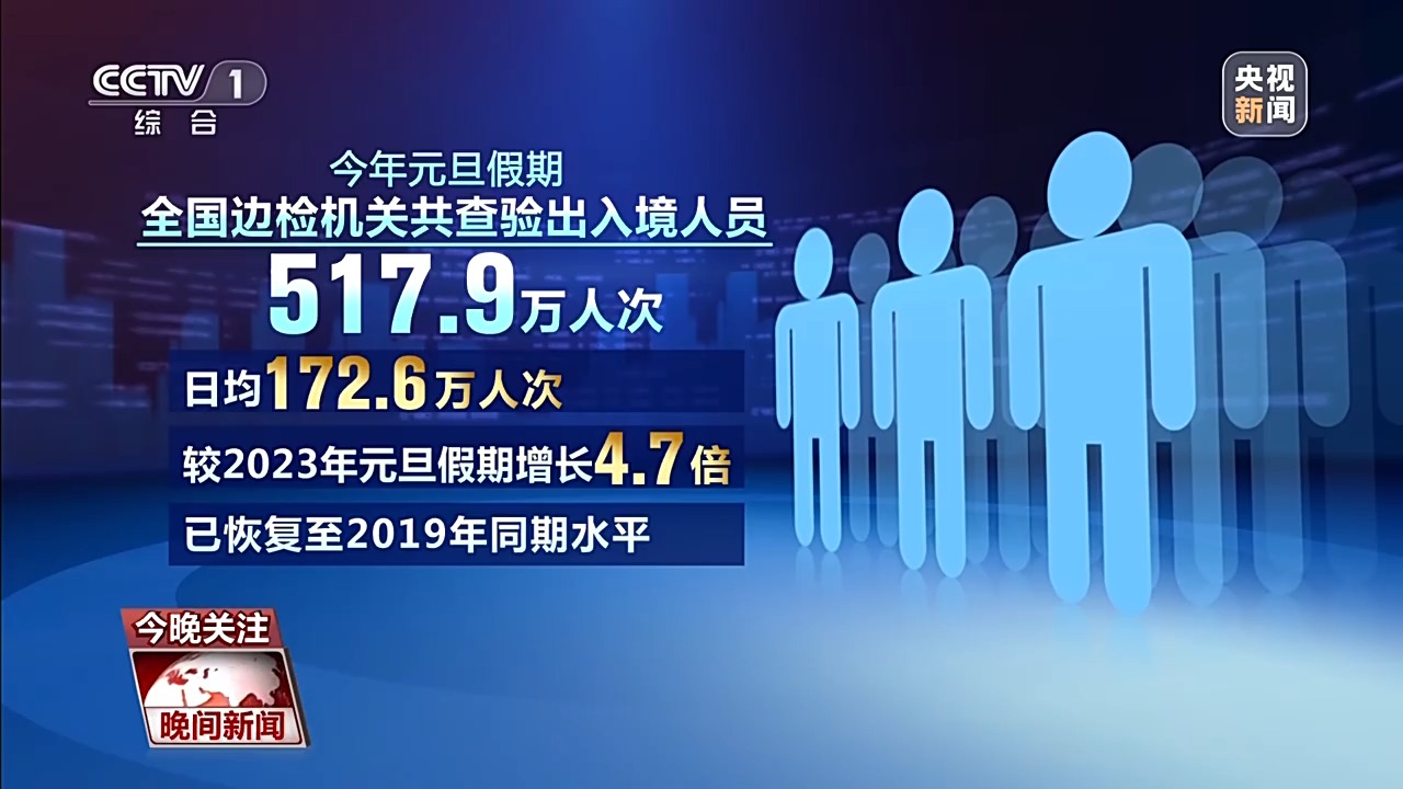另據(jù)國家移民管理局統(tǒng)計(jì),今年元旦假期全國邊檢機(jī)關(guān)共查驗(yàn)出入境人員517.9萬人次,日均172.6萬人次,較2023年元旦假期增長(zhǎng)4.7倍,已恢復(fù)至2019年同期水平。