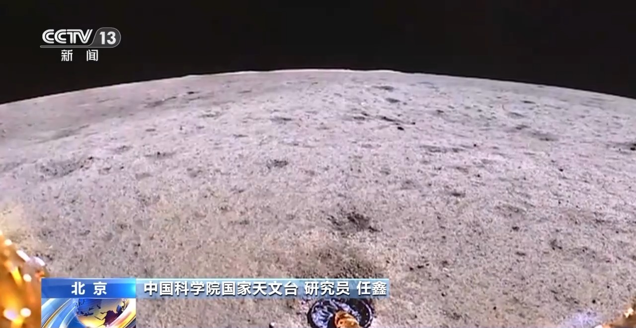 中國科學(xué)院國家天文臺研究員 任鑫:從這張全景圖看到的是著陸區(qū)特別平坦,首先反映出安全著陸區(qū)選的比較好,在遠(yuǎn)處的地方可以看到有一些山,這個實際上是在地平面以外更遠(yuǎn)距離的阿波羅盆地的一些環(huán)形坑的邊緣。