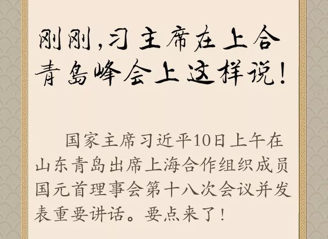 6月10日,上海合作組織青島峰會(huì)大范圍會(huì)談在青島國(guó)際會(huì)議中心舉行,習(xí)近平主持會(huì)議并發(fā)表重要講話(huà)。講話(huà)全文雖然不長(zhǎng)卻干貨滿(mǎn)滿(mǎn)、金句不斷,贏得了多次經(jīng)久不息的掌聲。 “捍衛(wèi)和平的力量終將戰(zhàn)勝破壞和平的勢(shì)力”、“未來(lái)無(wú)比光明,但前方的道路不會(huì)平坦”……習(xí)近平這些金句...