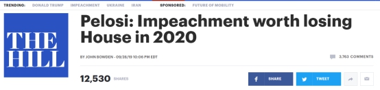 本月20日,知情人士爆出,特朗普在7月曾與烏克蘭總統(tǒng)通話,要求其調(diào)查2020年美國大選民主黨熱門候選人拜登的兒子,并且在該通話前一周傳令凍結(jié)了給烏克蘭的4億美元軍事援助。該事件傳出后,民主黨議員強烈要求彈劾特朗普。當(dāng)?shù)貢r間24日佩洛西在國會宣布,眾議院正式開啟針對特朗普的彈劾調(diào)查。