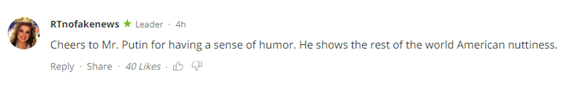 有網(wǎng)友稱贊道:“為普京的幽默干杯,他向世界展示了美國人的瘋狂。”↓
