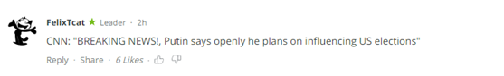 更有人借此諷刺起了美媒:“美國有線電視新聞網(wǎng):突發(fā)新聞!普京公開表示,他計(jì)劃影響美國大選。”