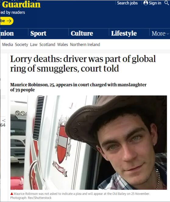 【環(huán)球網(wǎng)報(bào)道 記者 朱夢穎】英國“死亡貨車”謎團(tuán)仍未解,涉案司機(jī)28日通過視頻接受首次庭審。綜合英國《衛(wèi)報(bào)》、《太陽報(bào)》等多家外媒消息,據(jù)了解,被捕的貨車司機(jī)莫里斯·羅賓遜是一個(gè)跨國偷渡團(tuán)伙的成員。