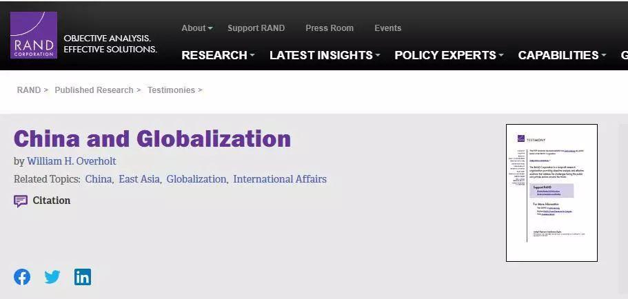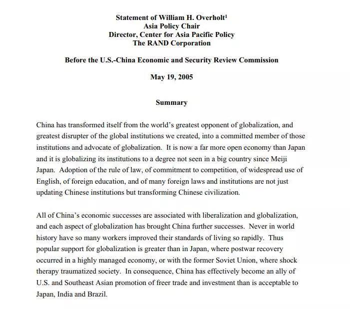 其中,“蘭德公司”版的謠言最初出現(xiàn)在2005年。當(dāng)年,美國蘭德公司發(fā)布了一個(gè)名為“中國與全球化”的報(bào)告,報(bào)告的內(nèi)容是該公司時(shí)任亞太政策研究中心的主任William H. Overholt在2005年5月19日向美國國會(huì)的“美中經(jīng)濟(jì)安全審查委員會(huì)”提交的一份關(guān)于中國發(fā)展情況的說明。