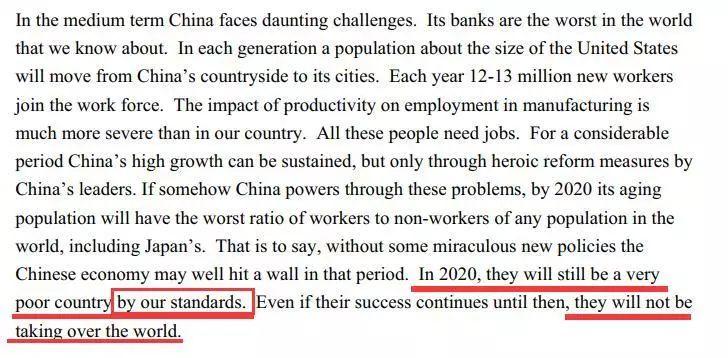 然而,這篇報(bào)告在當(dāng)年傳入中國時(shí),卻遭人“斷章取義”,其為了打消美國對(duì)華顧慮的大背景被刪掉了,肯定中國發(fā)展的部分也被刪掉很大一部分,被突出的反而是說中國問題的部分,以及在“失去前后語境”下的那句“中國2020年會(huì)是非常窮的國家”。