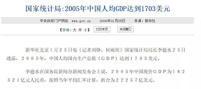 此刻,中國的國內(nèi)生產(chǎn)總值(GDP)已接近100萬億元人民幣,人均GDP也將邁上1萬美元的臺階。而在2005年那個“中國2020年成為世界最窮國家”謠言誕生的元年,中國的GDP僅為18萬億人民幣,人均GDP僅為1703美元。中國不僅沒有成為世界上最窮的國家,其即將跨國的人均GDP一萬美元的門檻,在一些財經(jīng)媒體看來,還預示著中國將步入“中高等收入國家”的行列。