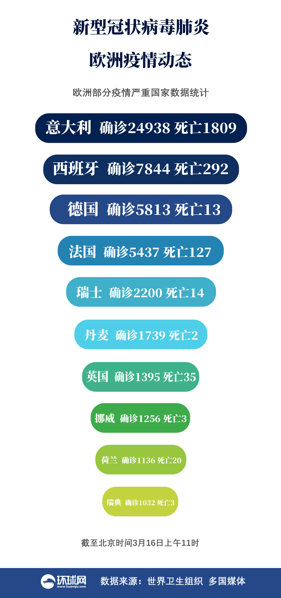 綜合外媒報道和數(shù)據(jù)統(tǒng)計,截至北京時間3月16日11時,意大利新冠肺炎累計確診病例達24938例,西班牙累計確診7844例,德國累計確診5813例,法國累計確診5437例。