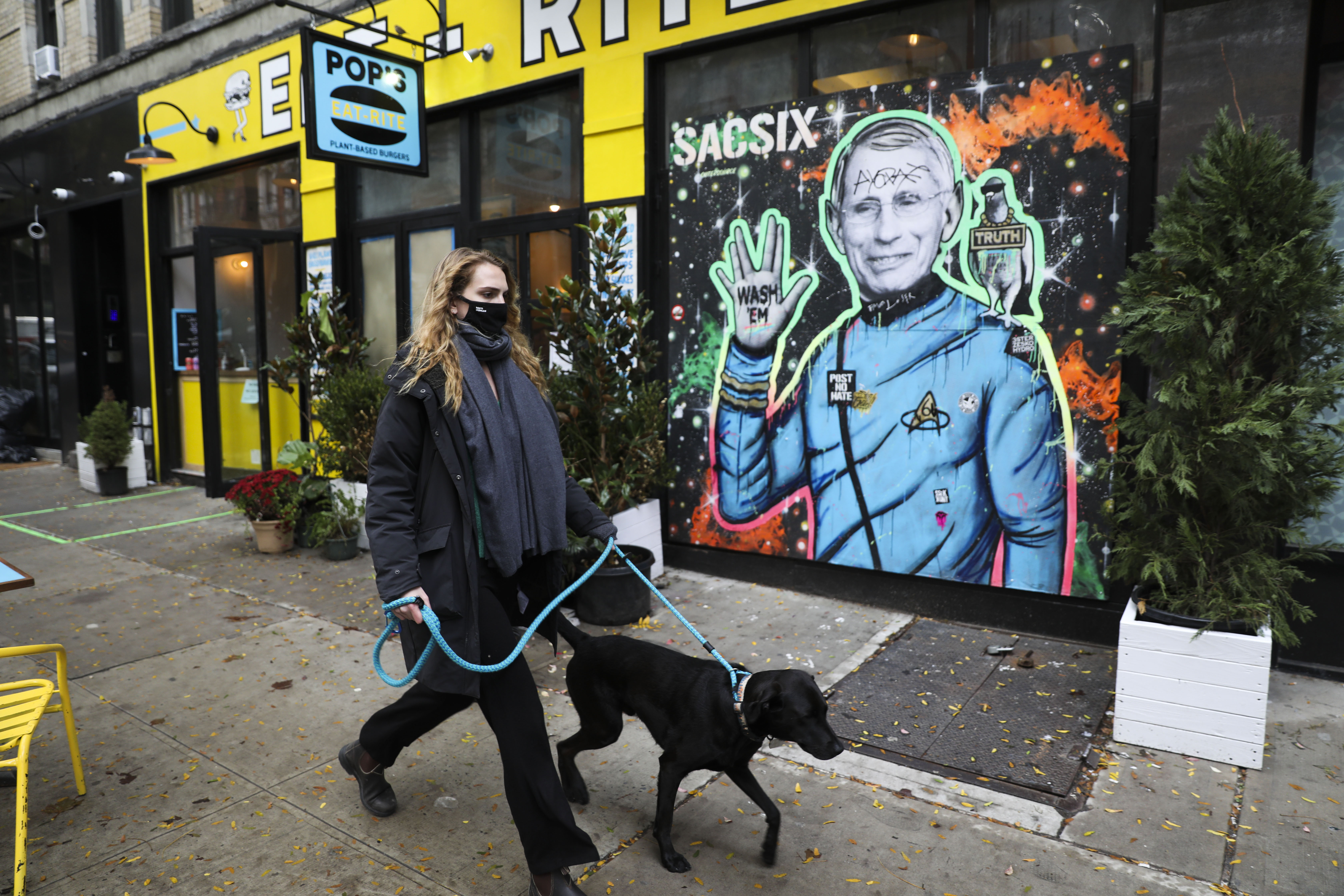 10月30日,在美國紐約,行人從一幅防疫壁畫旁走過。(新華社記者王迎攝)