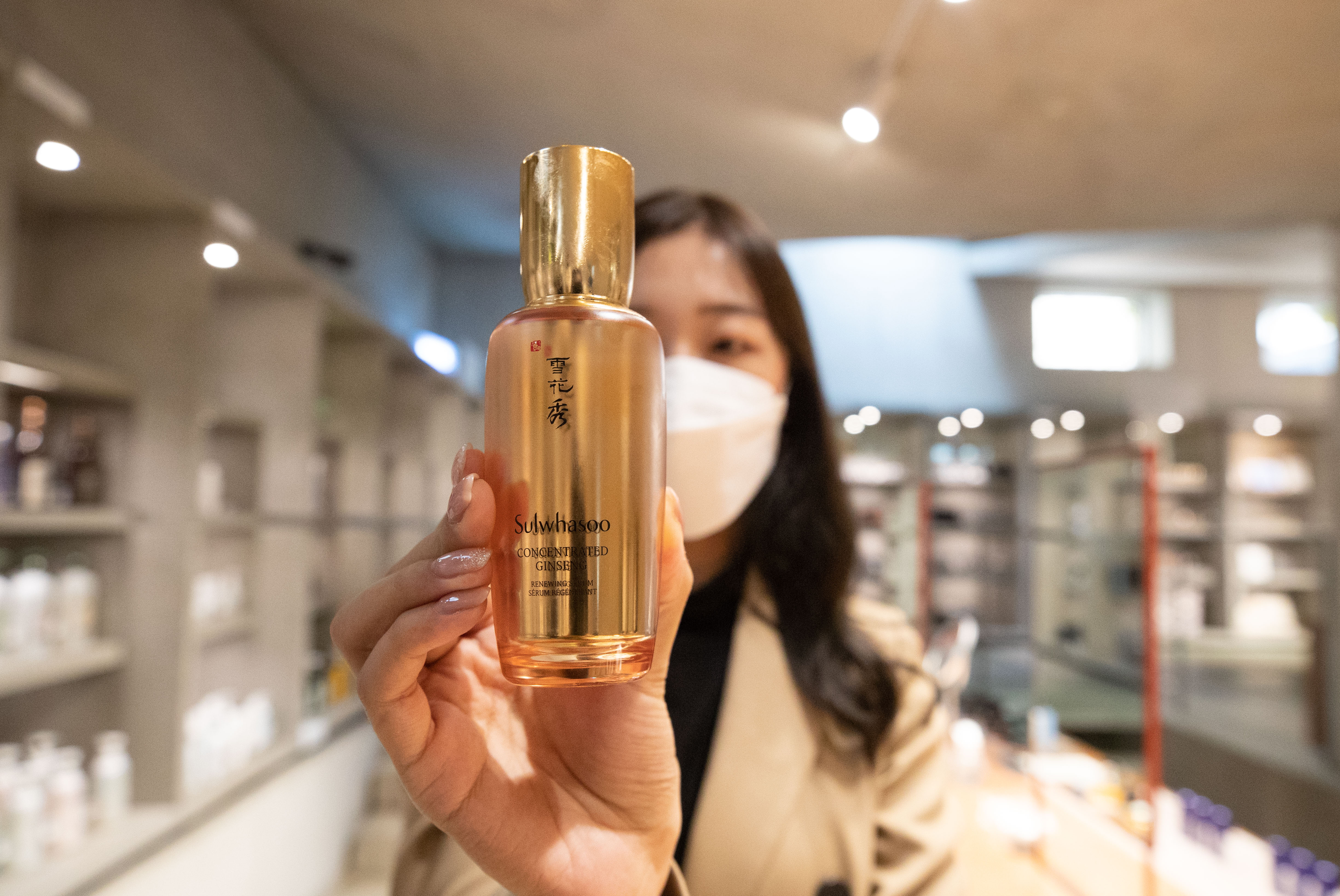 10月27日,一名工作人員在位于韓國(guó)首爾城東區(qū)的愛茉莉圣水美妝體驗(yàn)空間展示將在進(jìn)博會(huì)上推出的新產(chǎn)品。新華社記者王婧嬙攝