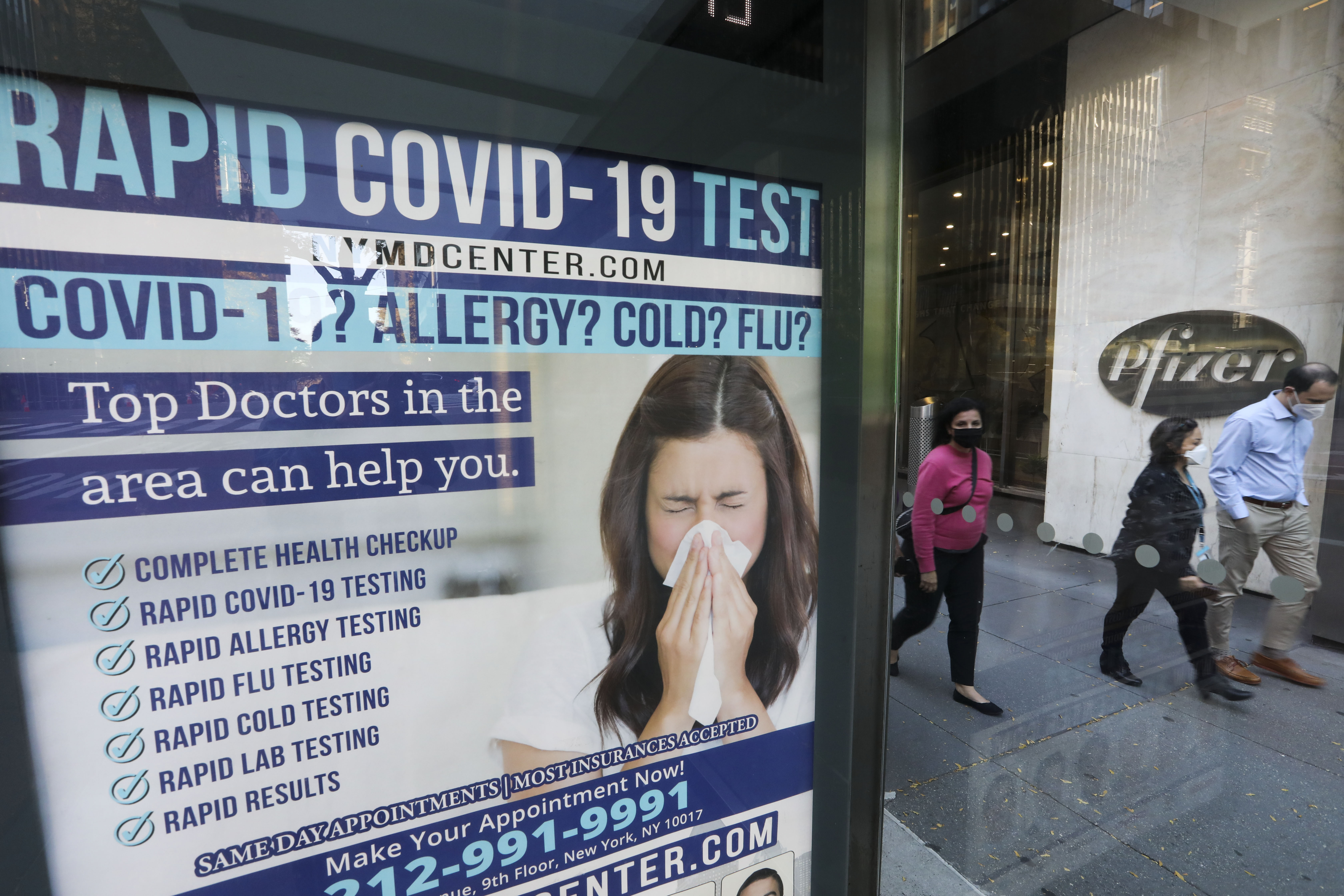11月9日,在美國紐約,人們從一處快速檢測新冠病毒的廣告旁走過。新華社記者王迎攝
