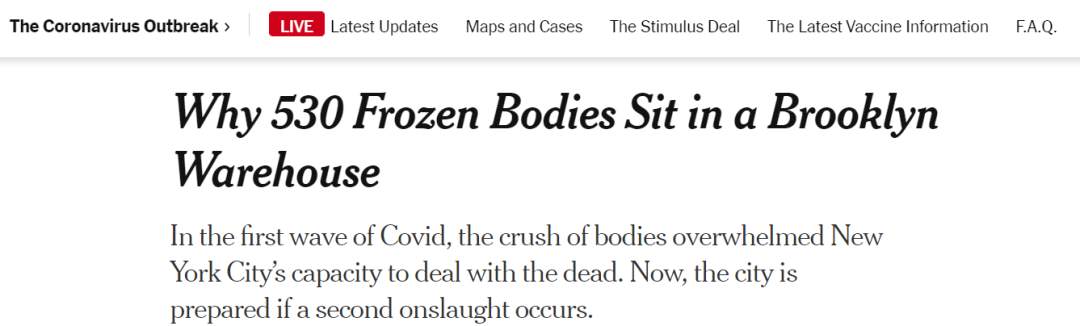 △當(dāng)?shù)貢r(shí)間26日,《紐約時(shí)報(bào)》發(fā)表題為《為什么布魯克林的倉庫里裝滿了530具尸體》的文章。(圖片來源:《紐約時(shí)報(bào)》)