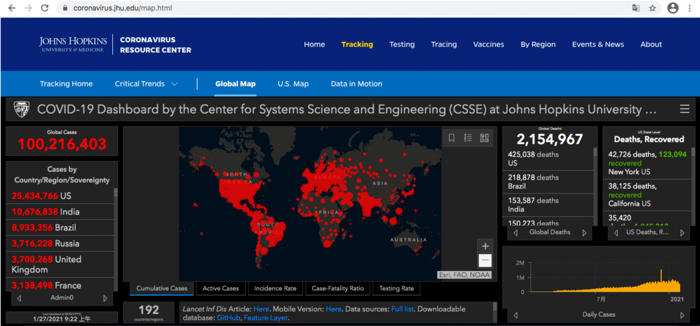 一個不斷膨脹的數(shù)字,在這個嚴(yán)寒的冬日攀升至九位:美國約翰斯·霍普金斯大學(xué)公布的最新數(shù)據(jù)顯示,截至北京時間27日,全球累計新冠肺炎確診病例數(shù)已超過1億。