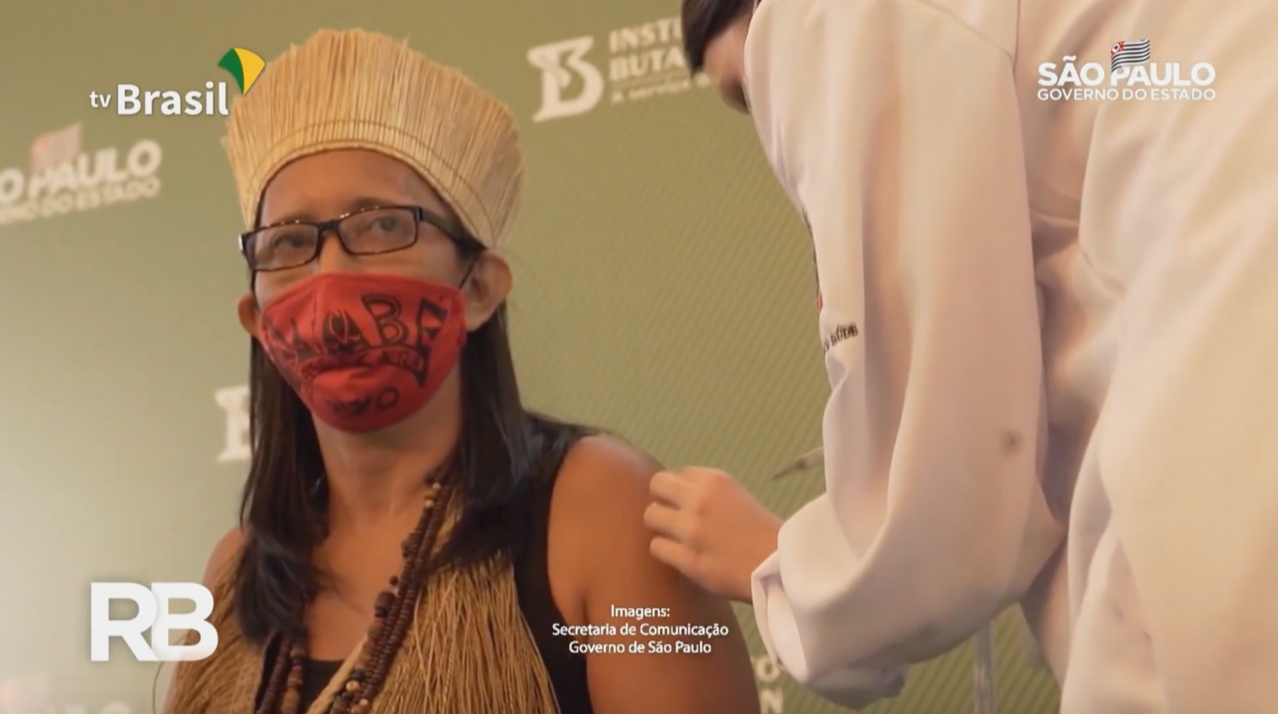 1月17日,巴西原住民中首位新冠疫苗接種者瓦努莎·凱姆貝在圣保羅大學(xué)臨床醫(yī)院接種中國新冠疫苗克爾來福。(視頻截圖)