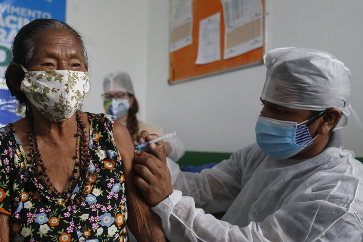 1月19日,在巴西亞馬孫州塔巴廷加市,醫(yī)護(hù)人員為一名原住民接種中國新冠疫苗。新華社發(fā)(盧西奧·塔沃拉攝)
