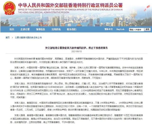 針對(duì)英國政府發(fā)表所謂“香港問題半年報(bào)告”,罔顧事實(shí),混淆是非,赤裸裸干預(yù)香港事務(wù)和中國內(nèi)政,嚴(yán)重踐踏包括“不干涉別國內(nèi)政”在內(nèi)的國際法原則和國際關(guān)系基本準(zhǔn)則,外交部駐港公署發(fā)言人表示強(qiáng)烈不滿和堅(jiān)決反對(duì)。
