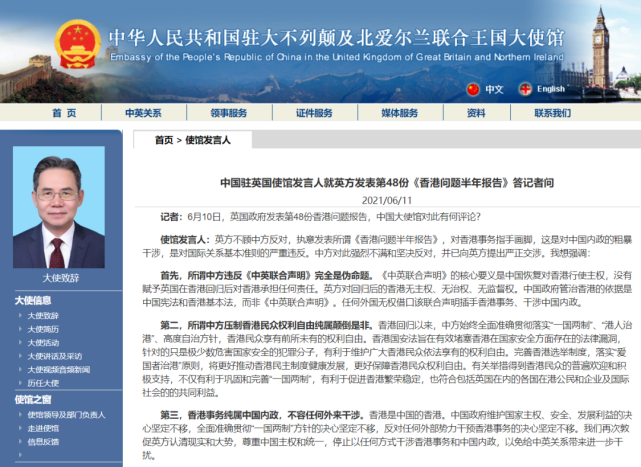 記者:6月10日,英國政府發(fā)表第48份香港問題報(bào)告,中國大使館對(duì)此有何評(píng)論?