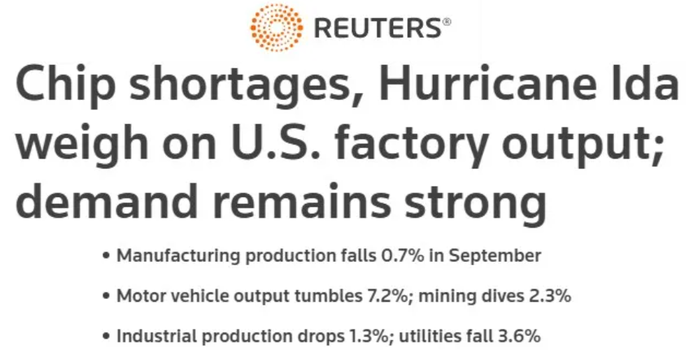與此同時,美國消費(fèi)者通脹預(yù)期達(dá)到歷史新高。最新數(shù)據(jù)顯示,美國9月消費(fèi)者價格指數(shù)(CPI)同比增幅達(dá)到13年來的最高水平,汽油價格更是比去年同期暴漲42%。如今在美國超市里,很多商品已經(jīng)處于缺貨狀態(tài)。