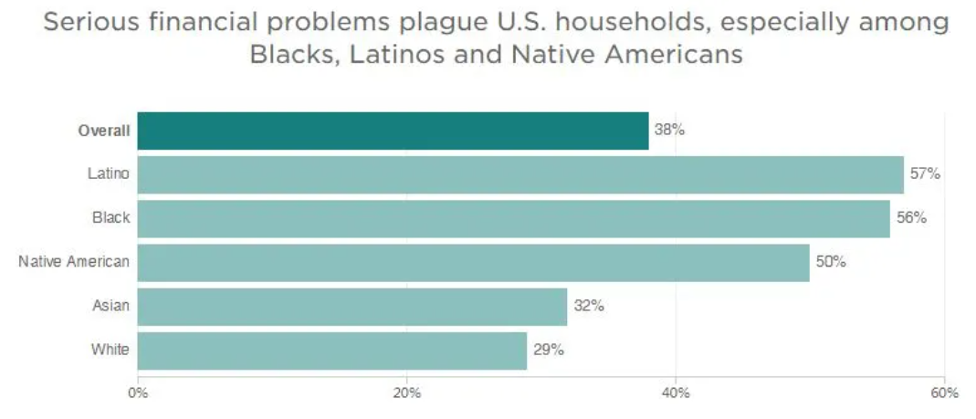 最新民調(diào)顯示,受疫情影響,38%的美國家庭過去幾個月來面臨嚴(yán)重的財(cái)務(wù)問題,甚至難以負(fù)擔(dān)醫(yī)療和食物費(fèi)用。其中,非洲裔、拉丁裔和原住民家庭受沖擊尤其嚴(yán)重,陷入經(jīng)濟(jì)困難的比例分別高達(dá)56%、57%和50%。