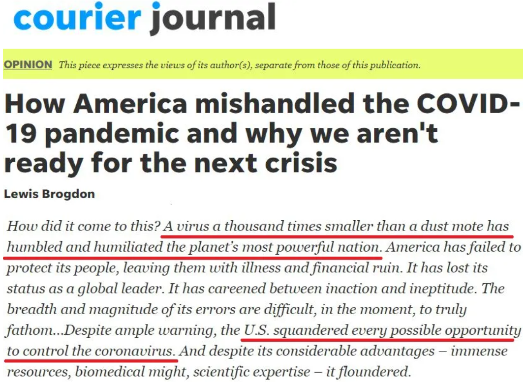 △布羅格登在美國《信使日報(bào)》刊登題為《美國如何錯誤應(yīng)對疫情以及為什么沒有為下一場危機(jī)做好準(zhǔn)備》的文章稱,由于美國政府抗疫不力,“一種比塵埃小一千倍的病毒羞辱了地球上最強(qiáng)大的國家”。