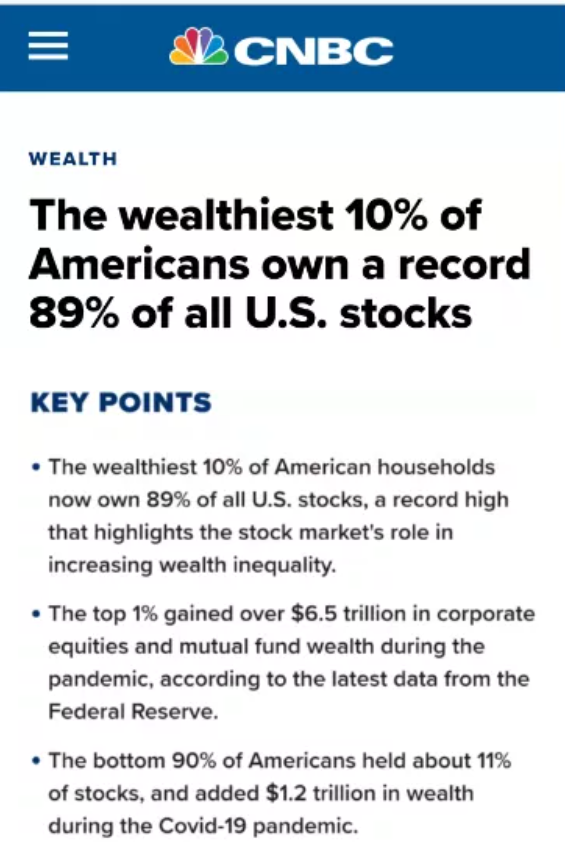 美聯(lián)儲最新數(shù)據(jù)表明,美國最富有的10%人群現(xiàn)在擁有美國89%的股票和基金持有權(quán);疫情期間,他們中最富有的1%人群靠著股票和基金增加了超過6.5萬億美元的財(cái)富。而其他90%美國人的財(cái)富總和只增加1.2萬億美元。
