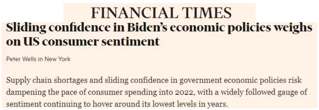 △英國《金融時報(bào)》報(bào)道:供應(yīng)鏈危機(jī)以及民眾對政府經(jīng)濟(jì)政策的信心持續(xù)下滑可能抑制消費(fèi)勢頭,這種局面或?qū)⒀永m(xù)至2022年。