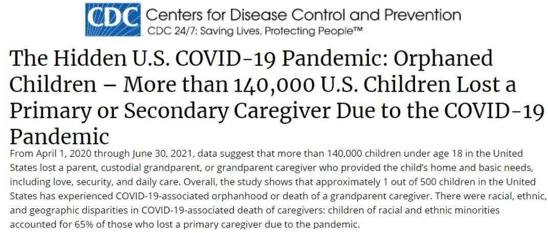 CDC近日發(fā)布報(bào)告稱,有超過14萬名美國兒童的父母或者祖父母、外祖父母因新冠肺炎去世,平均每500名兒童中就有一人失去至親。在少數(shù)族裔兒童中,這一比例更高。數(shù)據(jù)顯示,在失去主要照顧者的兒童中,白人兒童占35%,而少數(shù)族裔兒童占到65%。