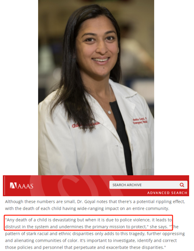 對(duì)于這種針對(duì)兒童的種族歧視暴力行為,美國國家兒童基金會(huì)學(xué)術(shù)事務(wù)和研究主任莫妮卡·k·戈雅爾醫(yī)學(xué)博士認(rèn)為,“任何兒童的死亡都是毀滅性的。但當(dāng)死亡是由警察暴力執(zhí)法造成時(shí),就會(huì)導(dǎo)致(民眾)對(duì)體制的不信任,并破壞其承擔(dān)的保護(hù)(民眾)的主要任務(wù)。種族歧視的(行為)模式只會(huì)加劇這樣的悲劇,進(jìn)一步壓迫和疏遠(yuǎn)少數(shù)族裔社區(qū)”。