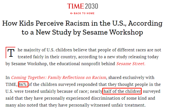 《時(shí)代》周刊近期獨(dú)家報(bào)道了美國教育非營利組織“芝麻工作室”的一項(xiàng)調(diào)查。根據(jù)名為《走到一起:家庭對(duì)種族主義的反思》的調(diào)查報(bào)告,86% 的受訪兒童認(rèn)為美國人因種族而受到不公平待遇,近半數(shù)接受調(diào)查的兒童親身經(jīng)歷過某種形式的歧視,許多兒童還親眼目睹了不公平待遇。