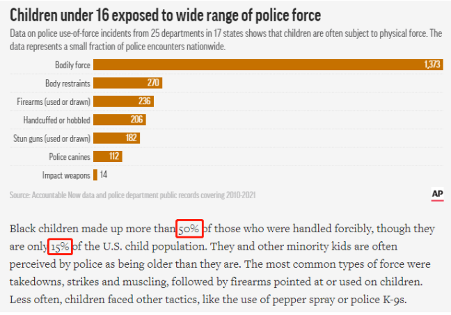 美聯(lián)社的調(diào)查顯示,雖然非洲裔兒童只占美國兒童的15%,但在被警察粗暴對(duì)待的兒童中,非洲裔兒童卻占50%以上。