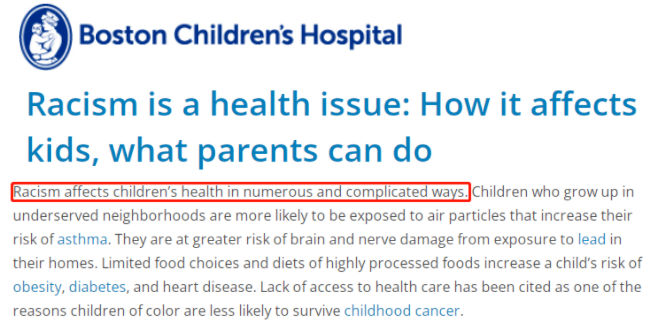 △美國波士頓兒童醫(yī)院網(wǎng)站的文章認(rèn)為,種族主義以許多復(fù)雜的方式影響兒童的生理健康。
