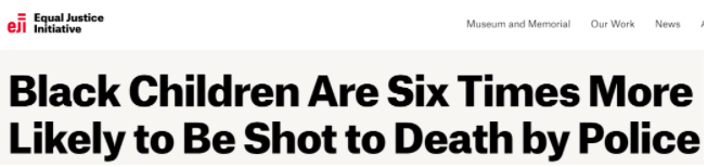 △非營利組織“平等正義倡議”官網(wǎng)截圖。該組織研究顯示,非洲裔兒童被警察槍擊的可能性是其他兒童的六倍。