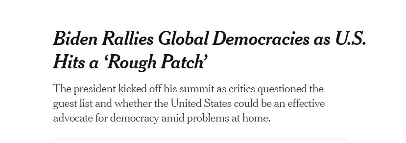 《紐約時(shí)報(bào)》報(bào)道的標(biāo)題為:拜登召集全球民主國(guó)家開(kāi)會(huì),但美國(guó)卻遭遇 “坎坷”。副標(biāo)題更是直接指出,在美國(guó)國(guó)內(nèi)面臨諸多問(wèn)題的時(shí)候,人們質(zhì)疑美國(guó)能否充當(dāng)一個(gè)合格的民主“代言人”。