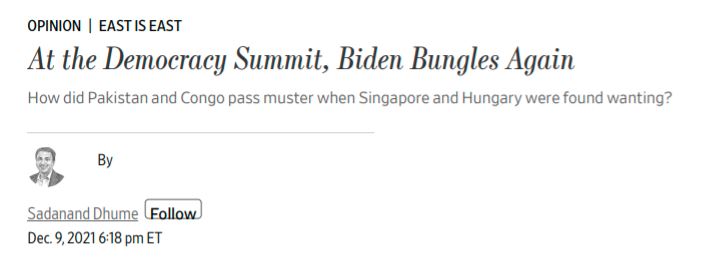 《華爾街日?qǐng)?bào)》的評(píng)論版則刊文《在民主峰會(huì)上,拜登又掉鏈子了》。
