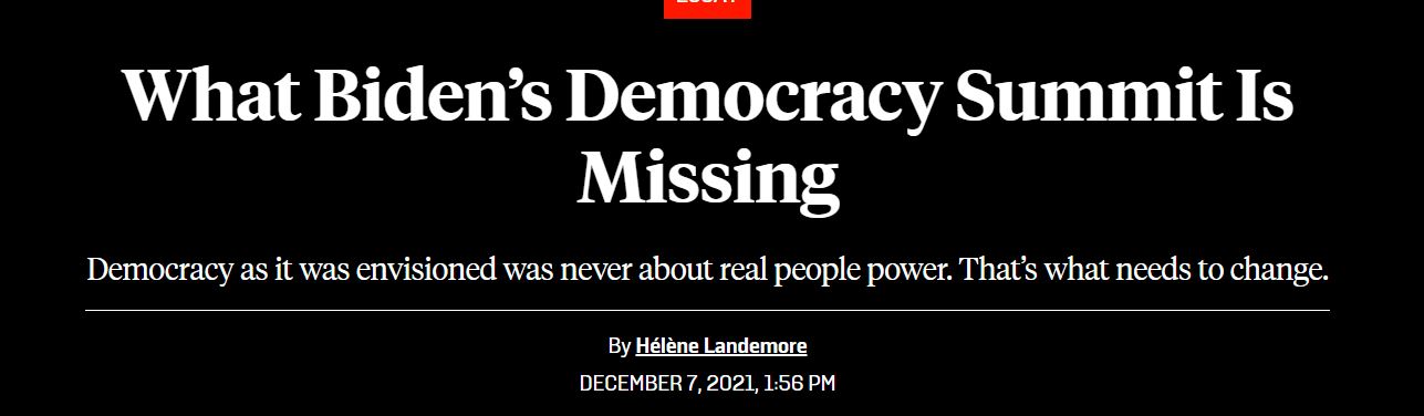美國(guó)《外交政策》的文章標(biāo)題為《拜登的民主峰會(huì)缺了什么?》,副標(biāo)題自問(wèn)自答:缺少了真正來(lái)自人民的力量。