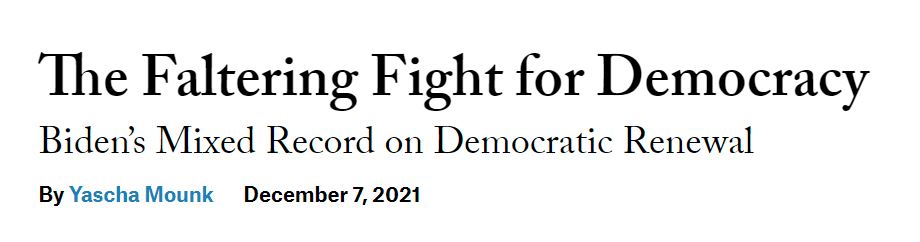 美國(guó)《外交事務(wù)》雜志刊文《爭(zhēng)取民主的努力舉步維艱》,文中說(shuō)拜登未能在全球范圍內(nèi)恢復(fù)人們對(duì)民主的信心。