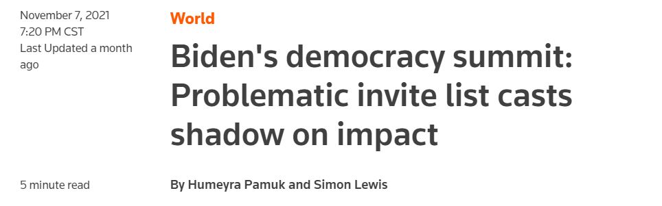 路透社的文章《拜登的民主峰會(huì):受詬病的與會(huì)名單讓峰會(huì)影響蒙受陰影》,質(zhì)疑所謂“民主峰會(huì)”邀請(qǐng)國(guó)家和地區(qū)的名單是否有充足依據(jù)。