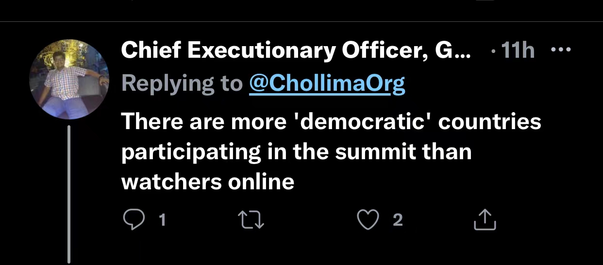 也難怪有網(wǎng)友嘲諷說(shuō):恐怕參加峰會(huì)的“民主”國(guó)家數(shù)量都比看直播的網(wǎng)友多。