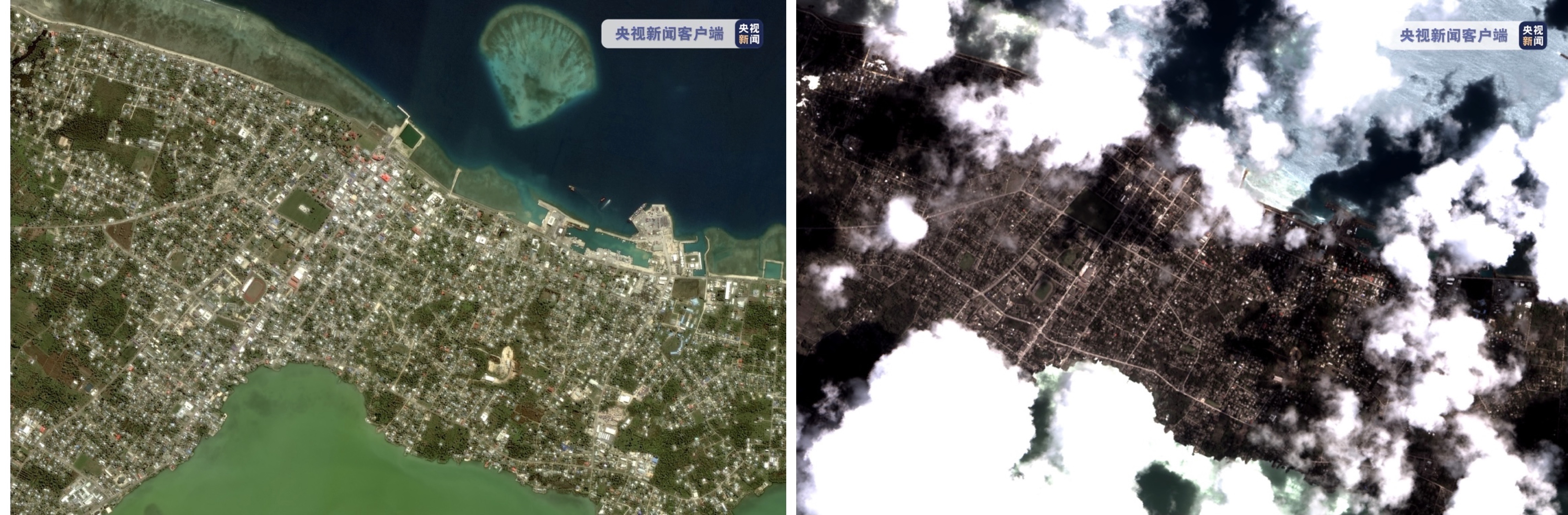 △湯加首都努庫(kù)阿洛法2020年8月(左)與2022年1月18日(右)影像